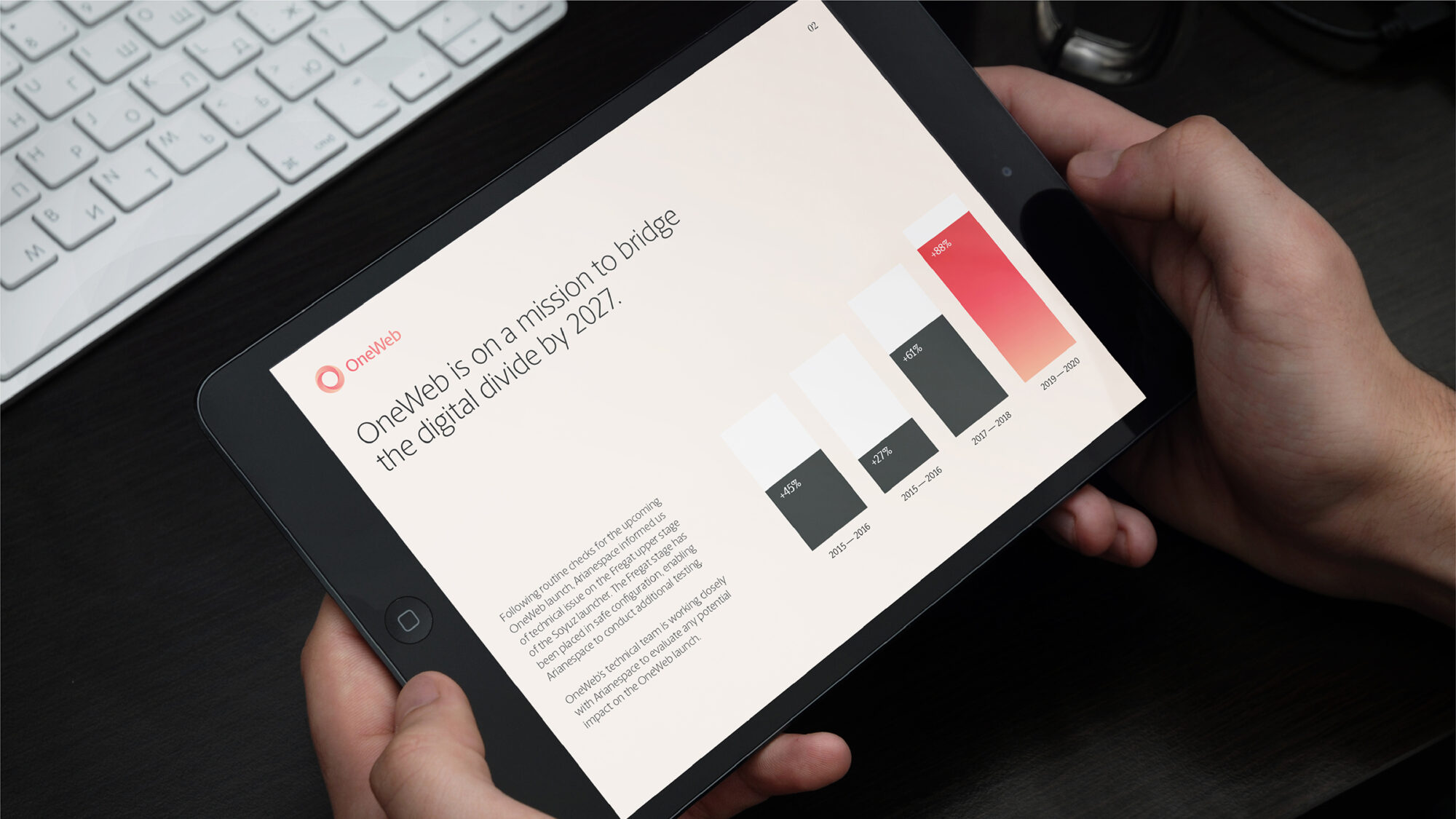 When OneWeb shifted their business strategy to focus on the commercial benefits of providing continuous connectivity across land, sea and air, they engaged Moving Brands to relaunch the brand. Our task was to communicate to all its audiences OneWeb’s mission to help bring prosperity, education, health, safety and entertainment wherever people are.