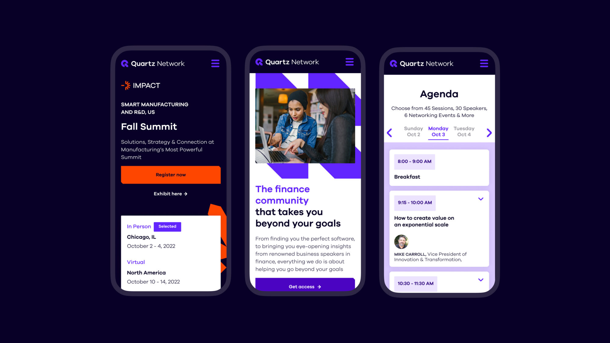 By defining Quartz Network’s brand architecture, we brought clarity to their variety of event categories. Four sub-brands were designed, with unique logos, graphic expressions, and vibrant color palettes.